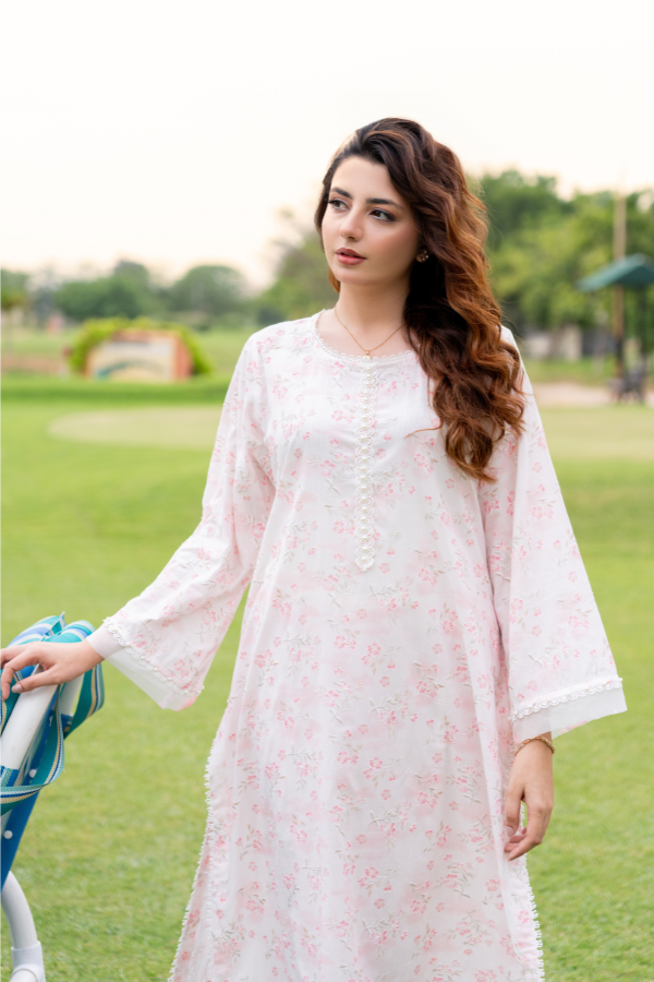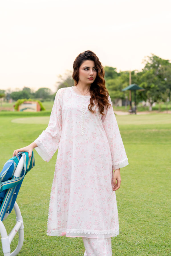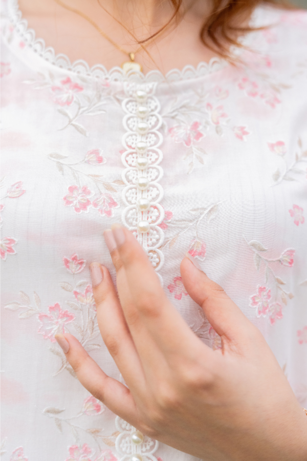 Designed from soft, breathable fabric for a graceful yet comfortable wear. Showcasing a pure white base beautifully enhanced with delicate pink floral embroidery. The V-neckline is highlighted with lace, pearls, and intricate triangular cutwork for a refined touch. Sleeves are adorned with matching triangular cutwork, pearl accents, and subtle sequins arranged in a star-inspired motif. Paired with straight pants in the same fabric for a perfectly coordinated and elegant finish.
