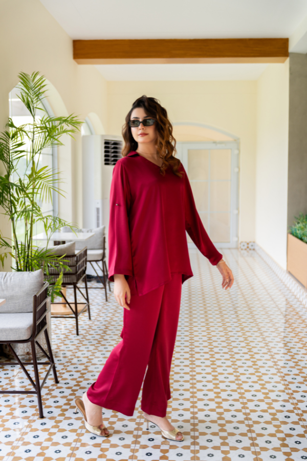 Crafted from premium butter silk with a luxuriously smooth finish. Light in weight and breathable, ensuring comfort throughout the day. Features a relaxed V-neck top with smart buttoned sleeves. Paired with straight-cut trousers designed for an easy, flattering fit. A versatile ensemble that transitions effortlessly between office hours and casual outings.